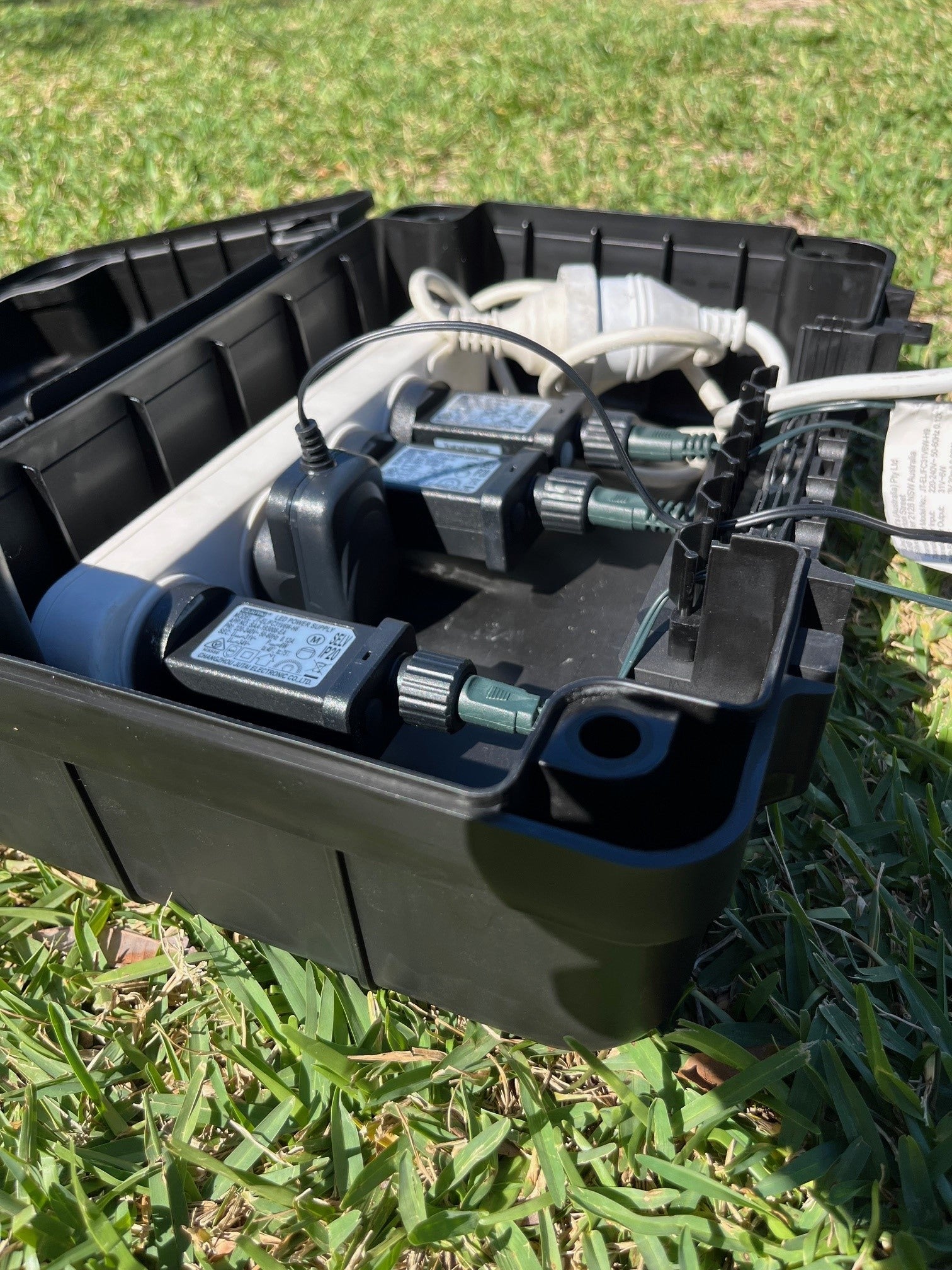The ultimate power box that protects multiple connections from the weather and dust. Ideal for Christmas lights, camping, boating. worksites, garden power tools and water features. It has a matte black finish,